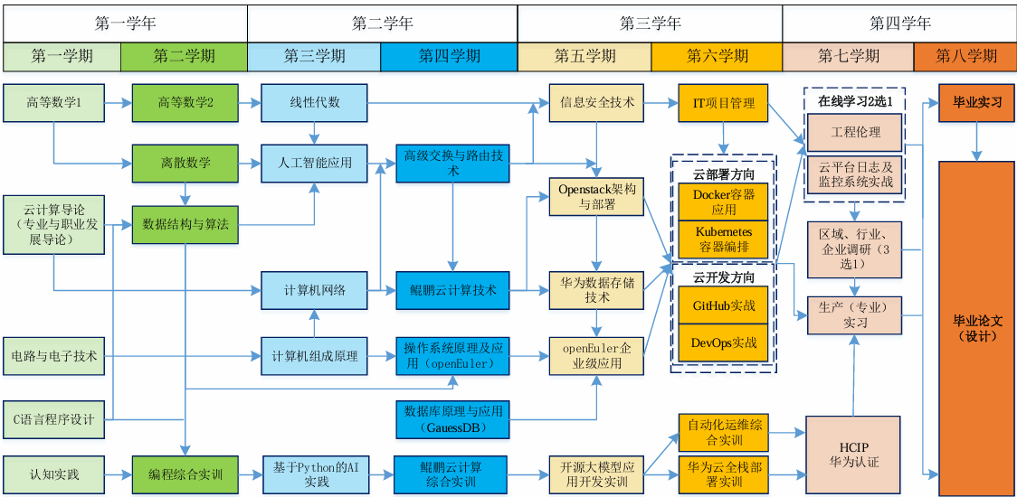 该专业核心课程以 “鲲鹏生态+全栈云技术+华为认证” 为主线,覆盖从应用开发到云平台运维的全链条能力。