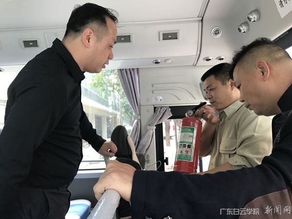 校长助理陈峰(左一)在检查车辆消防设备安全