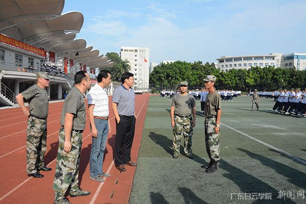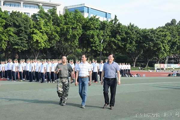 9月15日,广东白云学院新生军训第3天。下午,学校董事长谢可滔、校长黄大乾在学生处处长陈峰的陪同下,赴军训现场看望新生,5000余名新生以良好的精神面貌、显著的军训成绩向谢可滔董事长和黄大乾校长展示了他们的青春风采。