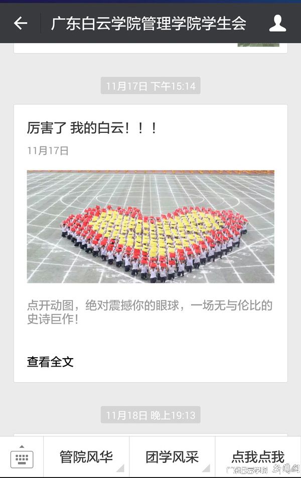 11月17日上午,广东白云学院以“努力拼搏,放飞梦想”为主题的第十八届校运会在西校区运动场隆重开幕,开幕式上龙狮表演、啦啦操、体育舞蹈、瑜伽、白云魔方和千人太极扇表演等节目惊艳全场。节目参与人数多,表演形式新颖,组织编排巧妙,引起了学校师生及社会各界人士的广泛好评。开幕式图片及视频经学校各级各类网络平台宣传,一天之内点击量突破7万人次,创历史新高。