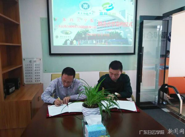 10月23日,我校校企办虞迅主任(左一)与广东富邦合创网络发展股份有限公司王帆总裁(右一)签订共建创业实训基地合作协议