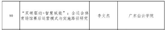 李文杰老师申报的《“双碳驱动 + 智慧赋能”:全运会体育场馆赛后运营模式与实施路径研究》,获 2025 年广州市哲学社会科学共建项目立项。项目将运用大数据技术,系统评估全运会体育场馆赛后利用现状,针对性提出可持续运营策略,为广州乃至全国大型体育场馆的绿色化、智慧化发展提供理论支撑与实践参考。