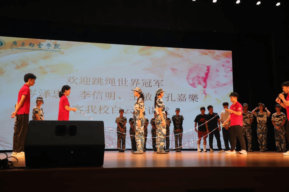 9月16日上午,白云大厅内热闹非凡。现场雷鸣般的掌声与阵阵惊叹声此起彼伏,一场别开生面的“喜迎十五运,跳绳冠军进校园”主题讲座在此热烈举行。世界跳绳锦标赛冠军获得者岑泽忠、李信明、王敏、孔嘉乐受邀莅临我校,为现场近千名师生带来了一场融合了励志分享、极限表演与零距离互动的体育盛宴,彻底颠覆了大家对“跳绳”这项运动的传统认知。