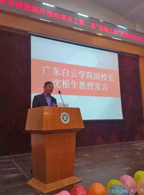 为提高学生的英语演讲水平,激发同学们学习英语的热情,广东白云学院外国语学院国际学院第二届“英语之星”英语风采大赛,于12月7日晚在儒学堂顺利举行。本次比赛由外国语学院英语教研室的孙国兴老师策划、指导,外教Ray, Neil, Paul及孙国兴老师、田键老师等担任评委,广东白云学院副校长兼任外国语学院国际学院院长沈根生教授、党总支书记朱玲、团总支书记梅俊强、辅导员谢远霞老师等也出席了本次活动。还有200名我院同学来到现场为参赛选手呐喊助威。