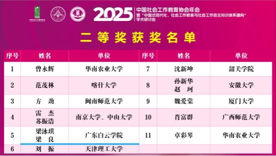 本届年会由中国社会工作教育协会主办,华南农业大学公共管理学院承办,广东省社会工作师联合会等单位协办,聚焦社会工作前沿议题,开展学术征文交流。经多轮匿名评审,我校教师基于本土实践和新颖视角脱颖而出。其中,梁泳琪、梁良团队获“二等奖”;梁良、张兴杰、梁泳琪、王毓琪团队,以及马焕英、付欢、薛源蕉子团队获“三等奖”。本次共计获奖7人,获奖数量与人数居全国高校前列,为社工系历届最佳成绩。