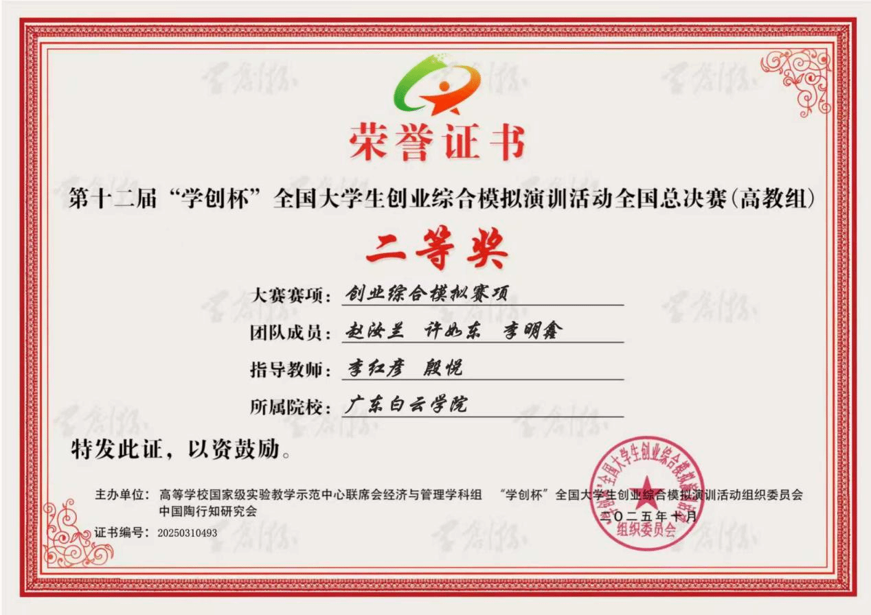 在第十二届“学创杯”全国大学生创业综合模拟大赛创业综合模拟赛项中,我校工商管理学院学生在广东省赛获得特等奖1项、一等奖1项、二等奖2项,省赛获奖数量和等级创历史新高,并且特等奖团队在国赛中获得二等奖,指导老师李红彦、殷悦老师在省赛、国赛均荣获“最佳指导教师”和“优秀指导教师”称号。