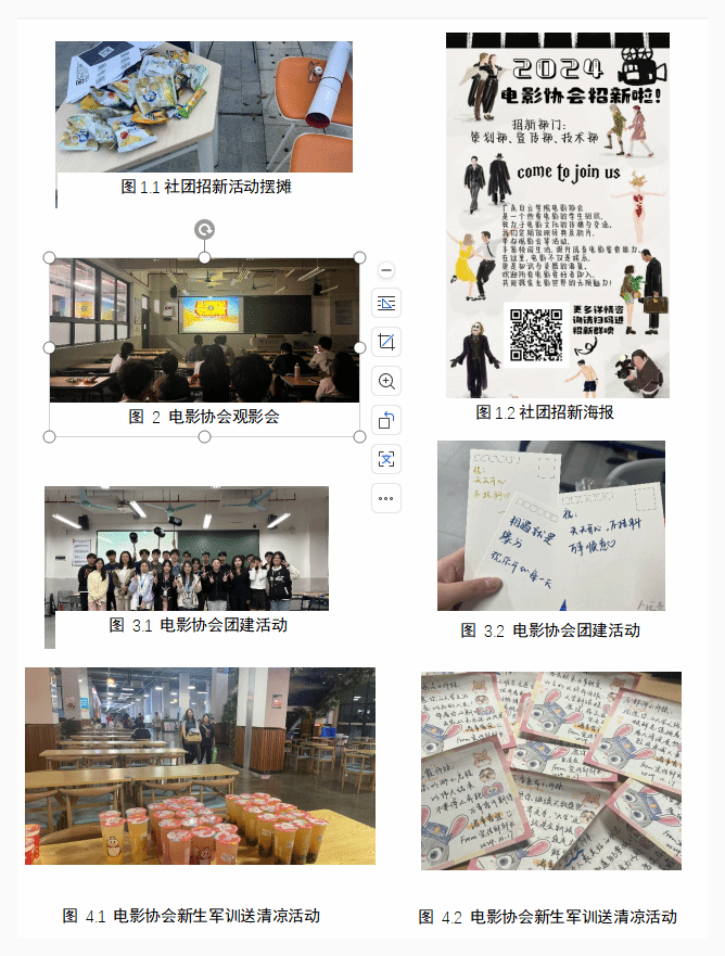 4、社团团建活动:每学期组织一次电影协会团建活动,在游戏中让各部门成员更熟悉彼此,加强团队的凝聚力和协作能力。