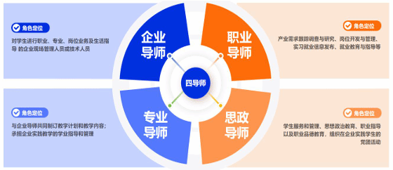 高水平师资和导师团队是产教融合人才培养的重要保障。学校在组织架构上搭建了三级产教融合保障体系:校8级层面设立产业研究与产教融合发展中心统筹政策与资源;各二级学院配备一名分管产教融合工作的副院长具体推进落实;专业建设中实行校内外“双导师制”,组建由职业导师、专业导师、企业导师、思政导师组成的“四导师”育人团队。四类导师各有侧重、相互配合:职业导师关注学生职业规划与就业指导,专业导师负责学业与技能培养,企业导师在学生企业实践中提供技术指导,思政导师加强价值引领与职业素养教育。通过完善的导师制,学生在校内学习和校外实践中都能获得精准指导,保证实践教学与理论教学同质等效。学校每年聘请企业导师200余名,涵盖华为、北京精雕、曙光信息等知名企业技术骨干,他们定期来校授课或带领学生实训。具有产业背景的“双师型”教师比例也逐年提高,不少青年教师通过到企业挂职锻炼提升了实践能力。“四导师制”的实施,使学校的人才培养在指导力量上实现了校企协同,为产教融合的人才培养质量提供了有力保障。