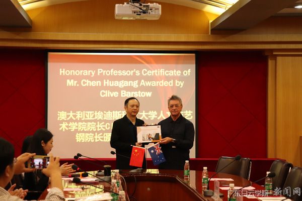 澳方院长Clive Barstow(右)为我校艺术设计学院院长陈华钢(左)颁发荣誉教授证