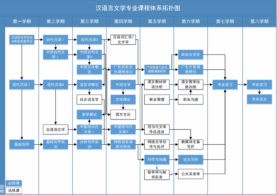 专业选修课:中国文化概论、美学概论、岭南文学、语言科技、媒介素养、创意写作等。