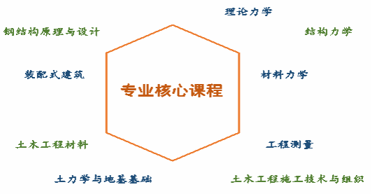 理论力学、材料力学、结构力学、工程测量、土木工程材料、土力学与地基基础、混凝土结构原理、钢结构原理与设计、装配式建筑、建筑BIM技术基础、土木工程施工技术与组织、建设工程监理与法规。