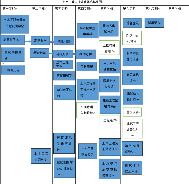 专业平台课程:1.房屋建筑学;2.装配式建筑;3.建筑设计;4.建筑结构;5.建筑施工技术;6.工程项目管理;7.工程造价;8.园林设计与规划;9.建筑设备;10.建筑材料;11.绿色建筑;12.建筑信息模型BIM