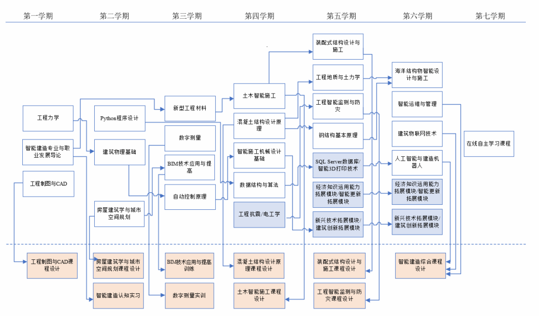 工程制图与CAD课程设计、智能建造认知实习、房屋建筑学与城市空间规划课程设计、BIM技术应用与提高训练、数字测量实训、混凝土结构设计原理课程设计、土木智能施工课程设计、装配式结构设计与施工课程设计、工程智能监测与防灾课程设计、智能建造综合课程设计。