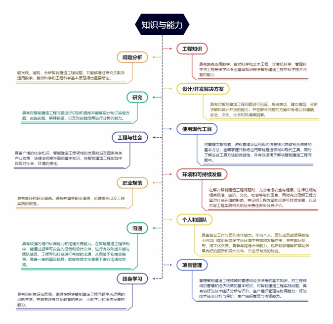 智能建造专业以服务大湾区智慧城市建设和建筑产业升级为核心,遵循“学生中心、产出导向、持续改进”的OBE教育理念,构建“学科交叉、产教融合、数智赋能”的人才培养体系。培养目标聚焦于掌握土木工程基础理论与智能建造核心技术,以“工程+数字”双主线构建课程体系,聚焦智能规划和设计、智能装备研发、智能运维管理、智能防灾四大方向,具备智能设计、数字化施工、智慧运维等全生命周期管理能力的高素质应用型人才。